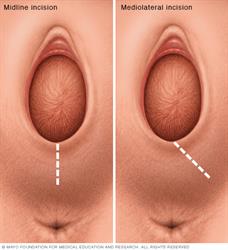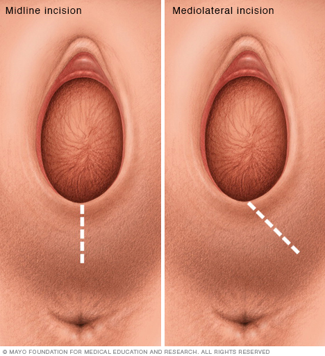 An episiotomy is an incision made in the perineum — the tissue between the vaginal opening and the anus — during childbirth. A midline (median) incision (shown at left) is done vertically. A mediolateral incision (shown at right) is done at an angle. A midline incision is easier to repair, but it has a higher risk of extending into the anal area. A mediolateral incision offers the best protection from an extended tear affecting the anal area, but it is often more painful and is more difficult to repair.