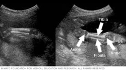 Below are images of the lower legs. The knee is on the right side of each image, and the ankle is on the left. You also can see the shinbone, called the tibia, and the small leg bone on the outside of the ankle, called the fibula.