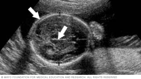 Below is a view of a fetus's head. The thicker white lines that form a circle are the skull. The white line in the middle of the circle is the midline structure that separates the baby's brain into its right and left halves. Head measurements can help determine the age of a fetus.