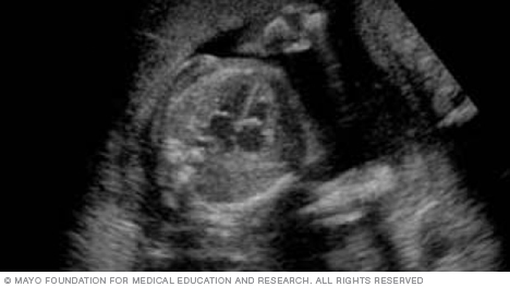 The image below shows all four chambers of the heart, as well as the heart valves. This type of image usually is taken during an ultrasound done between weeks 18 and 22 of pregnancy. Fetal ultrasound is used to check that the heart is working properly and to see if there could be any heart problems.