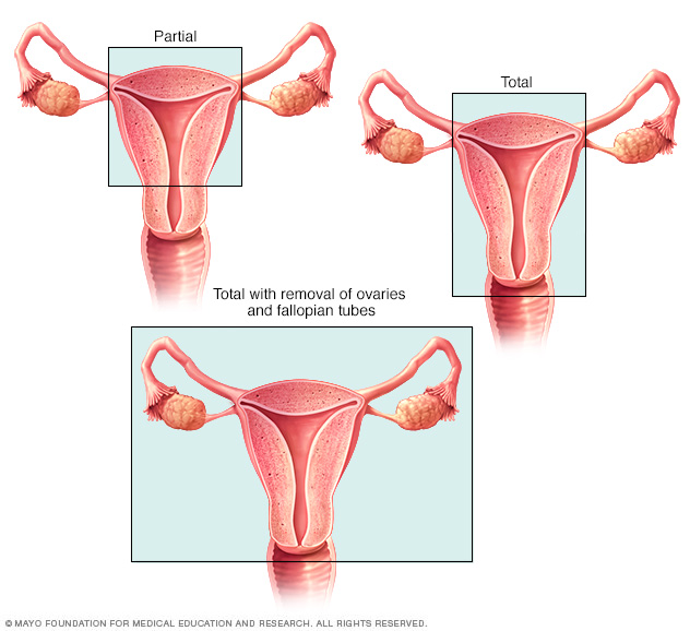 A partial hysterectomy, shown top left, removes the uterus. A total hysterectomy, shown top right, removes the uterus and cervix. The surgeon also may remove the ovaries and fallopian tubes, shown on the bottom.