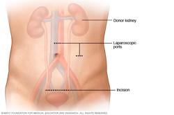 During a living-donor laparoscopic nephrectomy, two or three very small incisions (ports) about 5 to 12 millimeters in size are used to insert the laparoscopic equipment. A slightly larger, 5- to 7-centimeter incision is made above or below the bellybutton for removal of the kidney. The removal incision may be vertical or horizontal depending on your situation.