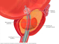 A small microwave antenna is inserted through the tip of the penis into the tube that carries urine from the bladder (urethra). Your doctor extends the antenna until it reaches the area of the urethra surrounded by the prostate. The antenna emits a dose of microwave energy that heats and destroys the excess prostate tissue that is blocking urine flow.