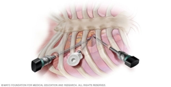 This type of surgery also is called a minithoracotomy. The surgeon inserts a long, thin video camera called a thoracoscope into a small incision between the ribs in the chest.