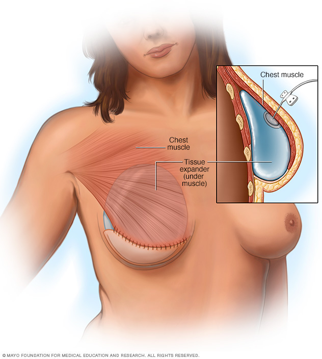 A tissue expander is a balloonlike device that helps stretch the chest skin and tissue to make room for a breast implant. A healthcare professional may slowly fill it with saline over a period of a few weeks to months. This picture shows the tissue expander under the chest muscle. The expander also can be placed on top of the chest muscle.