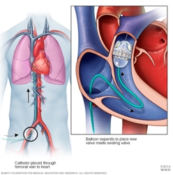 In a transcatheter valve-in-valve procedure, a heart surgeon inserts a thin, hollow tube called a catheter into a blood vessel, usually in the groin. The catheter is then guided to the heart. A replacement valve goes through the catheter. A balloon on the tip of the catheter expands to press the new valve into the existing pulmonary valve.