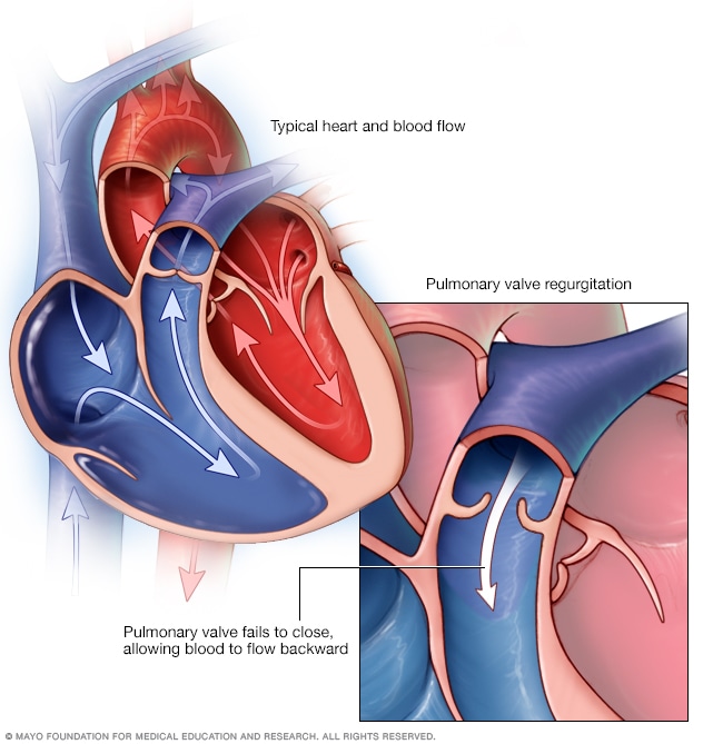 - Pulmonary valve regurgitation. The valve cusps may not close tightly, causing blood to leak backward. Blood goes backward into the heart instead of to the lungs.
