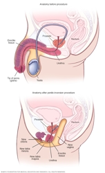 During penile inversion, the surgeon makes a cut in the area between the rectum and the urethra and prostate. This forms a tunnel that becomes the new vagina. The surgeon lines the inside of the tunnel with skin from the scrotum, the penis or both. If there's not enough penile or scrotal skin, the surgeon might take skin from another area of the body and use it for the new vagina as well.