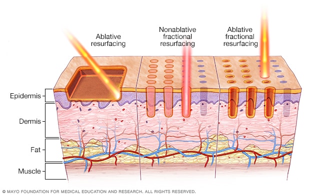 - Ablative laser. This method uses a beam of energy to destroy the outer layer of skin and heat the underlying skin. This stimulates the growth of collagen — a protein that improves skin firmness and texture. As the wound heals and skin regrows, the treated area is smoother and tighter. Types of ablative lasers include carbon dioxide (CO2) lasers, erbium lasers and combination systems.