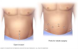 During an open prostatectomy, one large incision is made in the lower stomach area (left). During a robotic prostatectomy, several smaller incisions are made in the stomach area (right).