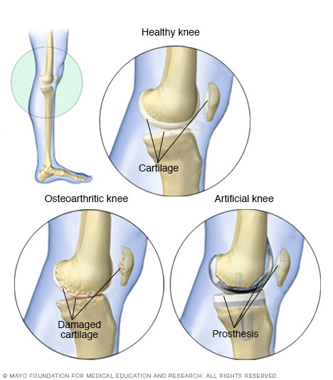 One of the most common reasons for knee replacement surgery is serious pain from joint damage. Joint damage is often caused by wear-and-tear arthritis, also called osteoarthritis. An artificial knee joint has metal caps to resurface the thighbone and shinbone, and high-density plastic to replace damaged cartilage. Each of these artificial parts is called a prosthesis.