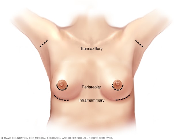 During breast augmentation, the surgeon makes an incision in one of three possible places: the crease under the breast, called inframammary; under the arm, called transaxillary; or around the nipple, called periareolar.