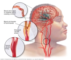 An ischemic stroke occurs when a blood clot, known as a thrombus, blocks or plugs an artery leading to the brain. A blood clot often forms in arteries damaged by a buildup of plaques, known as atherosclerosis. It can occur in the carotid artery of the neck as well as other arteries.