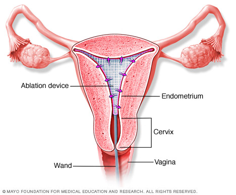 - Radiofrequency ablation. A special instrument opens a flexible, triangular device inside the uterus. The ablation device sends out radiofrequency energy that destroys the uterine lining in 1 to 2 minutes. The device is then removed from the uterus.