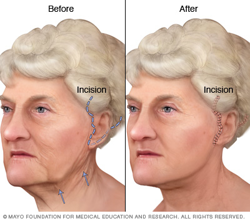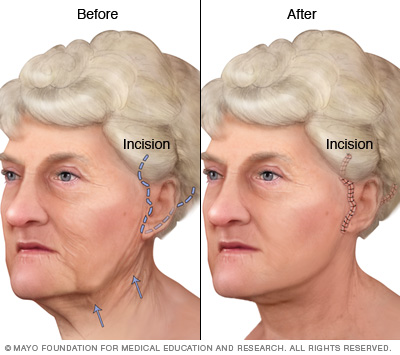 - A traditional face-lift cut. This starts in the hairline at the temples, then moves down and around the front of the ears. It ends behind the ears in the lower scalp. You might have a cut under the chin to help your neck look younger.