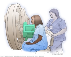 You sit in a chair facing the molecular breast imaging system. It looks kind of like a mammogram machine. One breast is placed on the flat surface of a gamma camera in front of you.