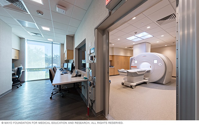 The MRI scanner is in a separate room from the technicians who operate the machine and capture the images of your brain. You can communicate between the rooms through a speaker.
